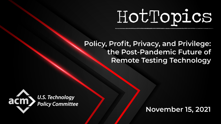 ACM's US Technology Policy Committee (USTPC) will host a HotTopics webinar session, "Policy, Profit, Privacy, and Privilege: The Post-Pandemic Future of Remote Testing Technology," on Monday, November 15 at 5:00 pm EST. Don't miss this timely, deep-dive discussion into the accuracy, security, and fundamental fairness to less-advantaged students of remote testing administration (RTA) systems, and what their future will or should be.