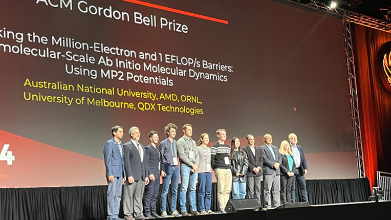 An eight-member research team from Australian and American institutions has been awarded the 2024 ACM Gordon Bell Prize for their project, “Breaking the Million-Electron and 1 E FLOP/s Barriers: Biomolecular-Scale Ab Initio Molecular Dynamics Using MP2 Potentials.” Using their algorithmic innovations on a powerful exascale computer, the team achieved a record-breaking performance of simulating more than one million electrons for a computational chemistry application and scaling their algorithm to an exaflop per second, resulting in a simulation 1,000 times larger in system-size than the existing state-of-the-art and 1,000 times faster than any previous model.