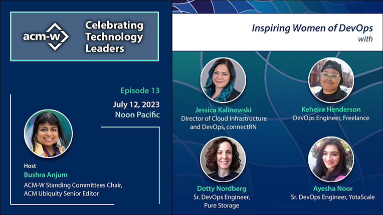DevOps engineering is a relatively new career focused on building bridges between the developmental and operational sides of software development. But what does it take to become a DevOps engineer, and what does the career progression look like? What kind of work environment do they operate in, and what are their most significant challenges? And is it a promising career for women in tech? In this episode of "ACM-W Celebrating Technology Leaders," taking place July 12, 2:30 pm EDT (6:30 UTC) you will hear from women technologists with successful DevOps careers to learn from their experiences, both as DevOps and as women in the field. Join the panel—Jessica Kolinowski (connectRN), Kaheira Henderson (Freelance), Dotty Nordberg (Pure Storage), and Ayesha Noor (YotaScale)—with host Bushra Anjum and learn more about DevOps and the opportunities it may offer.